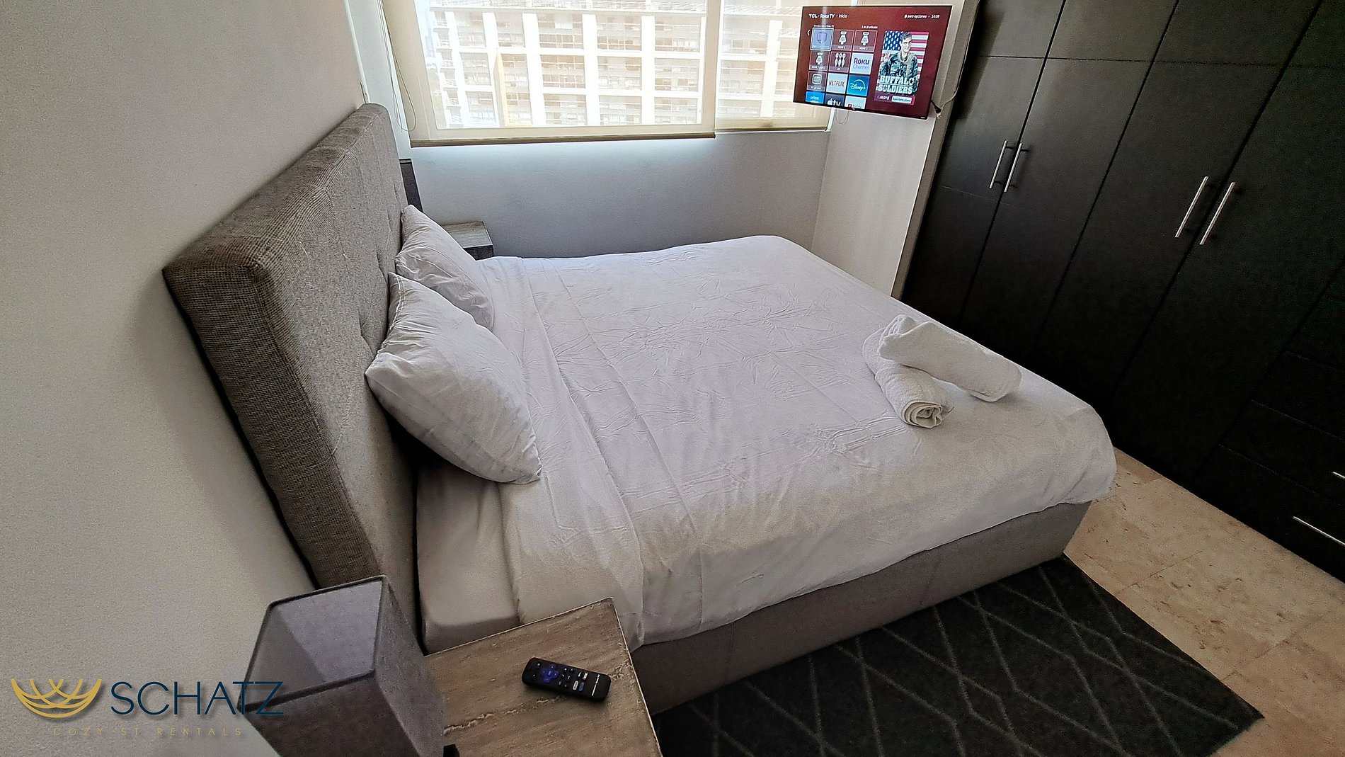 The master bedroom has a queen-size bed, large closets, and a 40" Smart TV. The second bedroom has a double bed and a desk with an armchair.