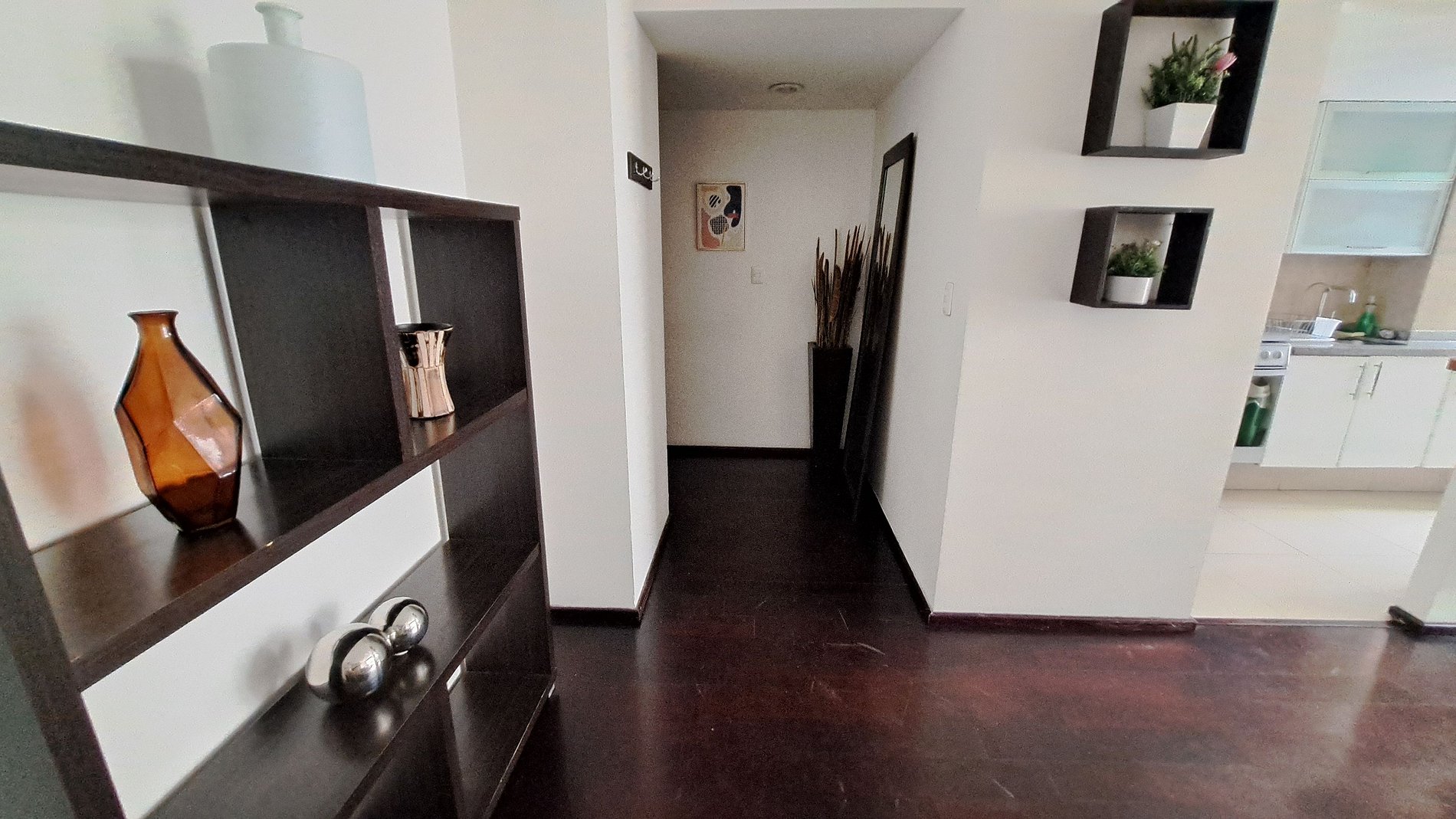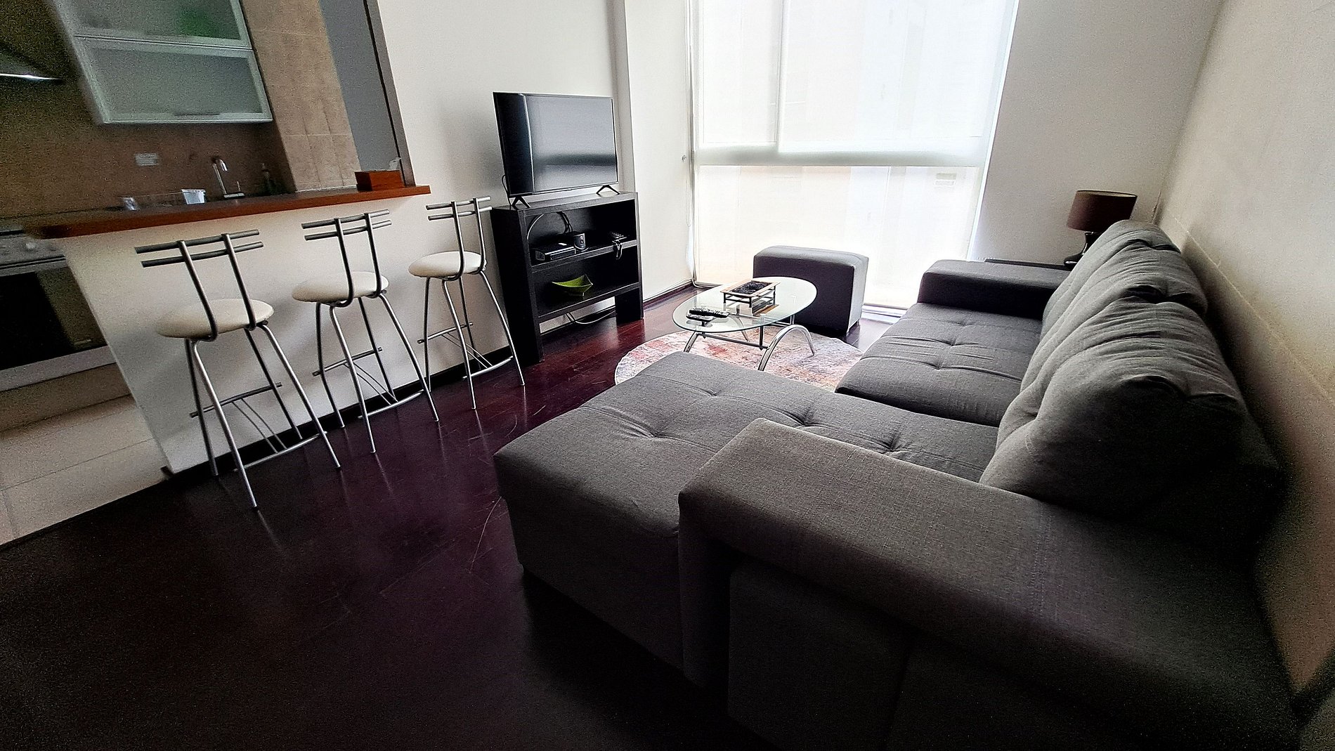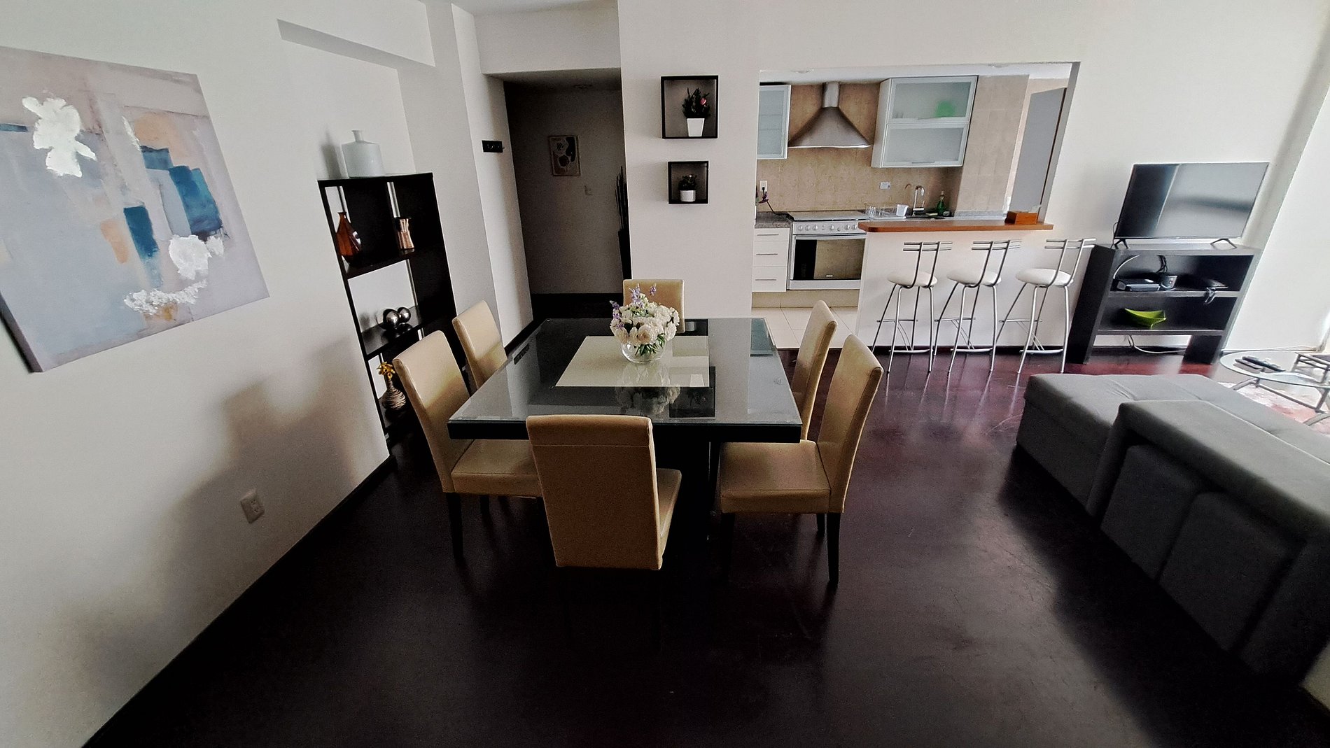 The main highlight of this apartment is its spacious common area with a well-lit dining and living room illuminated by natural light, perfect for spending time with friends or family after a day of work or exploring the city. The apartment features a master bedroom with a queen-size bed and a 37" screen with Roku system, along with an en-suite bathroom. The secondary bedroom is equipped with a double-size bed and a generous closet. The living area features a 45” SmartTV with cable TV access. Its open-plan kitchen is equipped with a washing machine, water dispenser for large bottles, refrigerator, microwave, coffee maker, toaster, blender, as well as utensils, dishes, glasses, cups, bakeware, and pans for preparing any dish. There is broadband WiFi coverage throughout the apartment as well as in the various public areas.