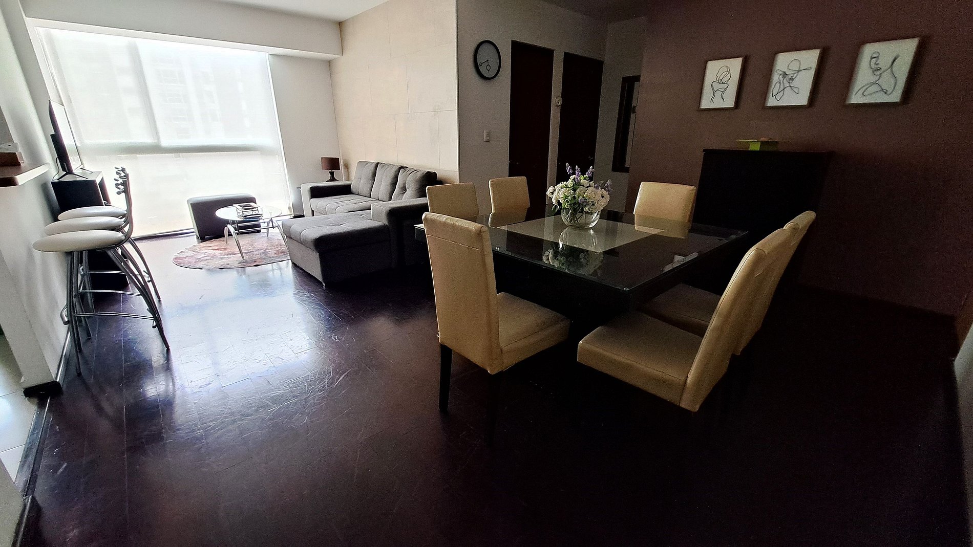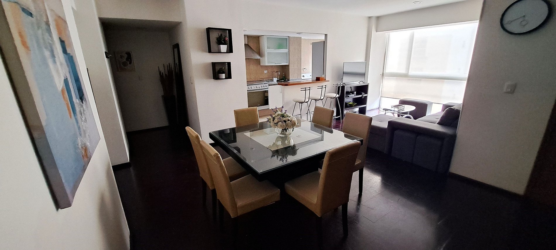 The main highlight of this apartment is its spacious common area with a well-lit dining and living room illuminated by natural light, perfect for spending time with friends or family after a day of work or exploring the city. The apartment features a master bedroom with a queen-size bed and a 37" screen with Roku system, along with an en-suite bathroom. The secondary bedroom is equipped with a double-size bed and a generous closet. The living area features a 45” SmartTV with cable TV access. Its open-plan kitchen is equipped with a washing machine, water dispenser for large bottles, refrigerator, microwave, coffee maker, toaster, blender, as well as utensils, dishes, glasses, cups, bakeware, and pans for preparing any dish. There is broadband WiFi coverage throughout the apartment as well as in the various public areas.