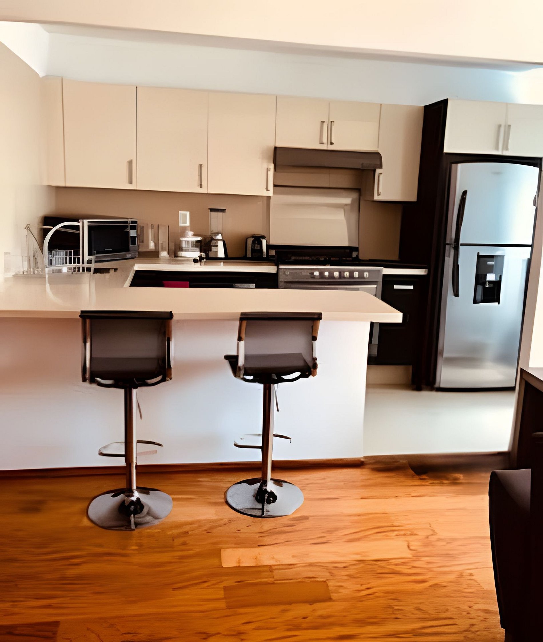 Su cocina tiene una barra americana con 3 bancos y está equipada con lavadora, filtro de última generación para agua potable, refrigerador, microondas, cafetera, tostadora, licuadora, así como utensilios, vajillas, vasos, copas, refractarios y sartenes para preparar cualquier platillo. Hay cobertura de WiFi de banda ancha en todo el departamento, así como en las diversas áreas públicas.
