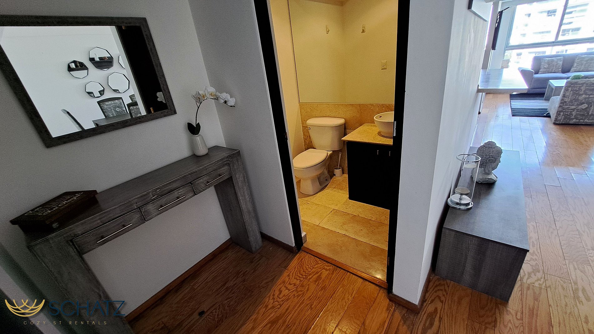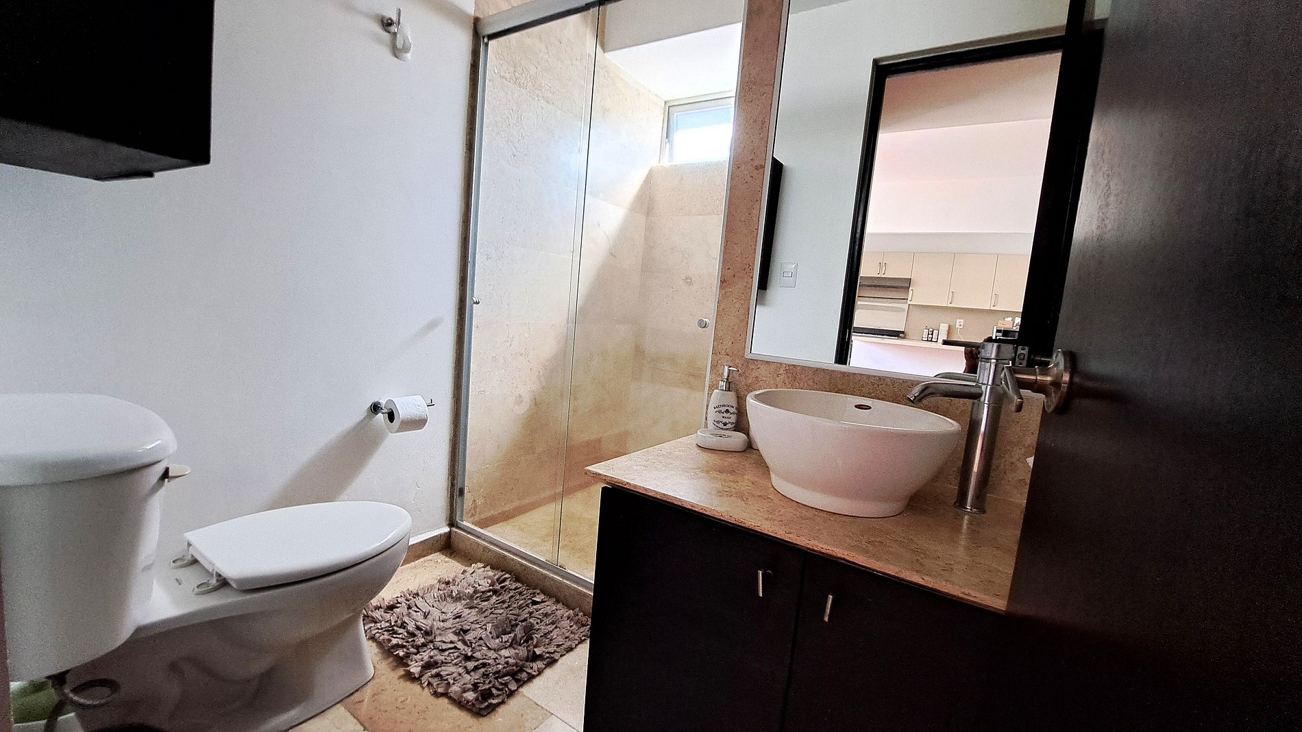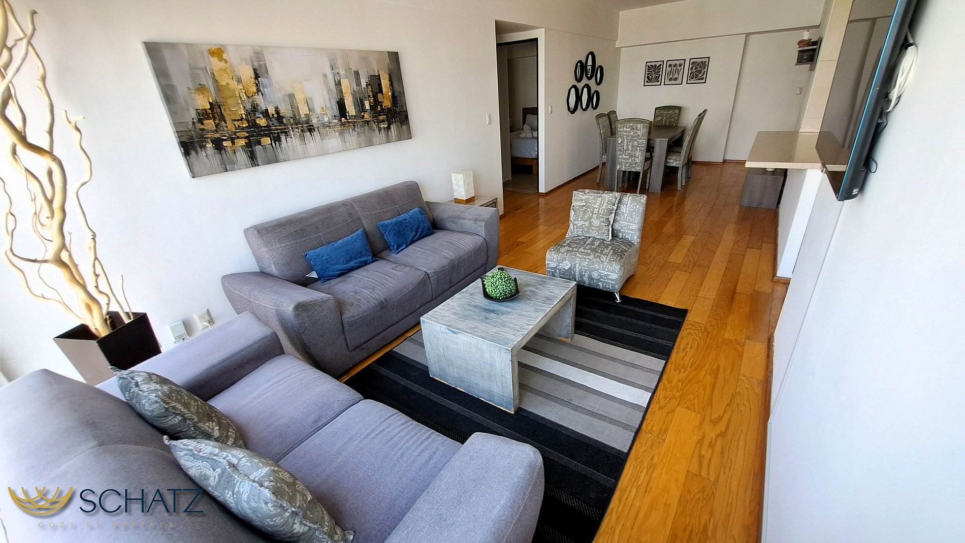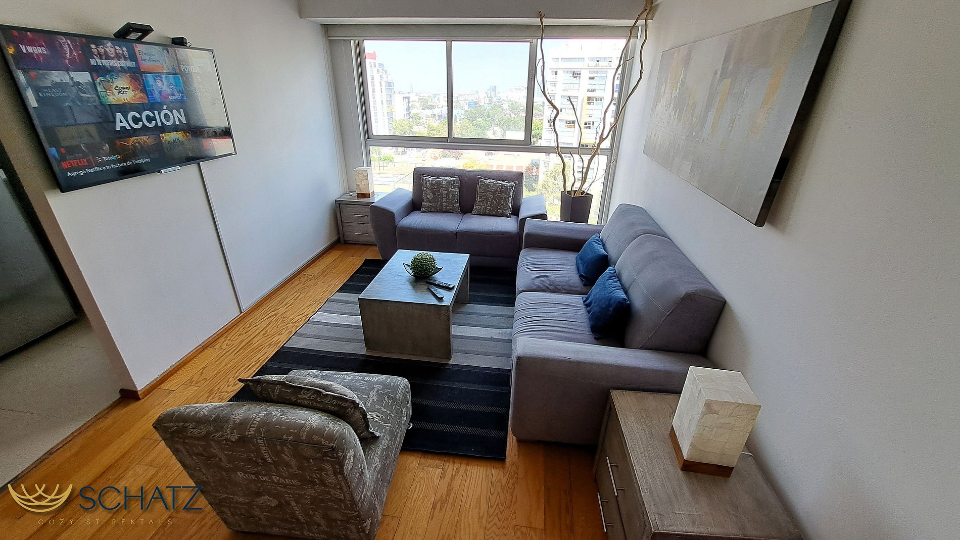 El máximo atributo de este departamento es su amplia estancia con comedor y sala para 6, con SmartTV de 50” y TV de cable, ideal para convivir con amigos o la familia. Al estar en un extremo del edificio, todas las áreas del alojamiento cuentan mucha luz ya que todas tienen ventana con ventilación natural.