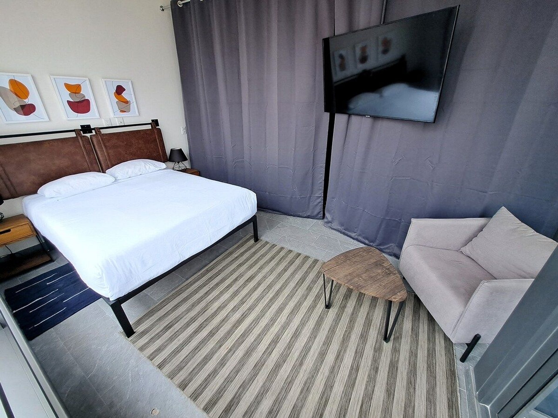 El máximo atributo de esta suite es su gran estancia con comedor para 4 personas y un cómodo sofá-cama en L que se convierte en 2 camas individuales o una tamaño queen, y complementado con su smart tv de 55” lo hacen el espacio deal para convivir con la pareja o amigos. La amplitud de su closet y baño con centro de lavado aumentan el nivel de confort del alojamiento. Su cocina tiene una barra con 3 bancos y está equipada con refrigerador, microondas, cafetera, tostadora, licuadora, así como utensilios, vajillas, vasos, copas, refractarios y sartenes para preparar cualquier platillo. Hay cobertura de WiFi de banda ancha en todo el departamento, así como en las diversas áreas públicas. Su recámara tiene una cama tamaño queen y gracias a las persianas black-out y lujosas cortinas divisorias, le proveen de una plena privacidad y oscuridad ante el resto del alojamiento. Por si fuera poco, su balcón con ofrece una espectacular vista panorámica de la ciudad.